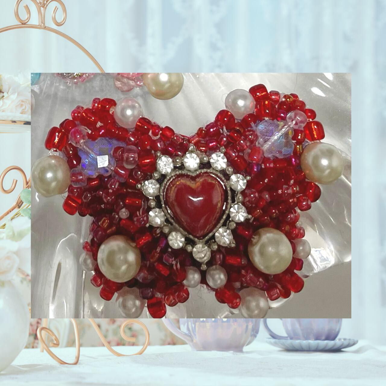 蝶々のブローチを、物語をモチーフにお仕立てしました。こちらは赤の女王をイメージしたカラーです。