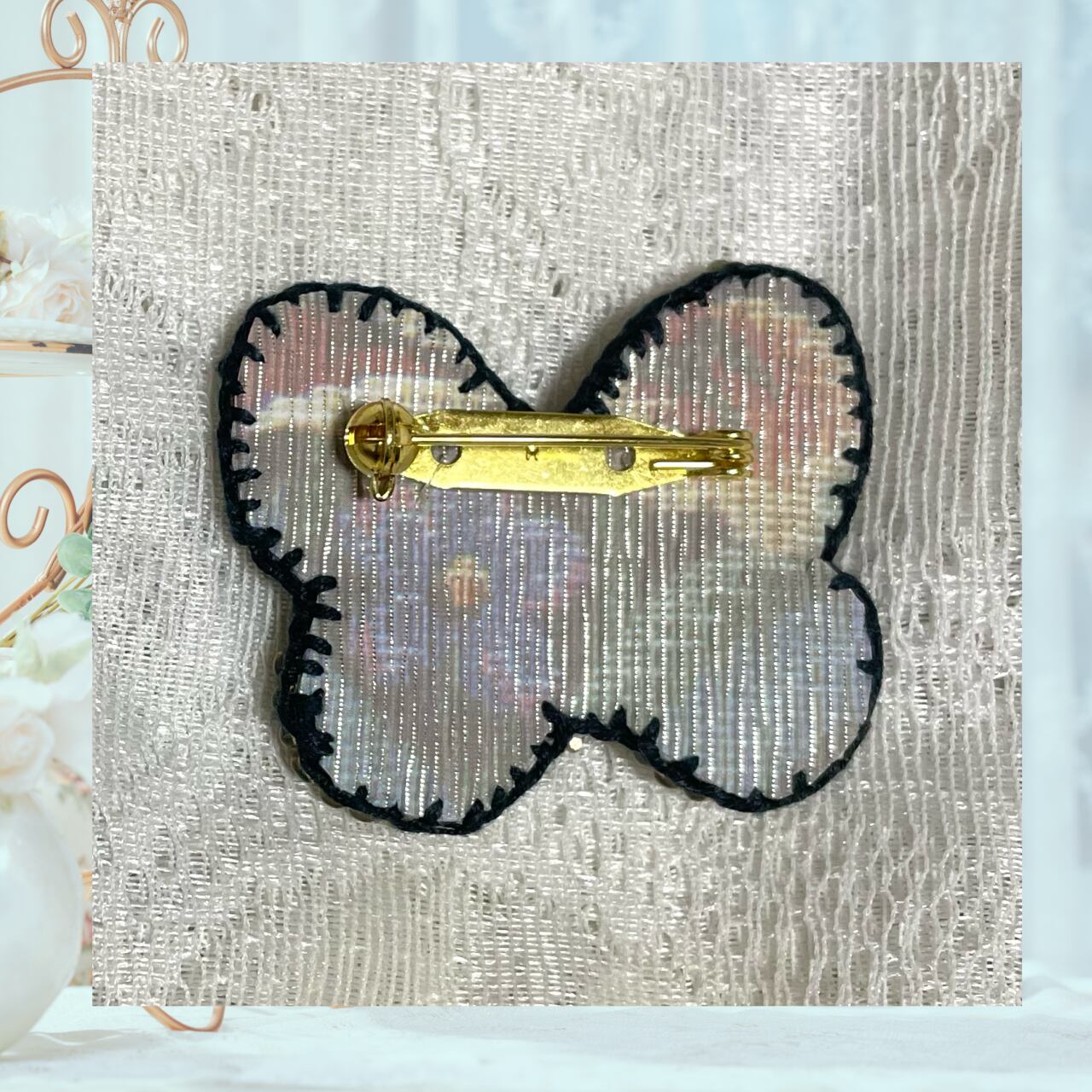 蝶々のブローチを、物語をモチーフにお仕立てしました。こちら騎士イメージしたカラーです